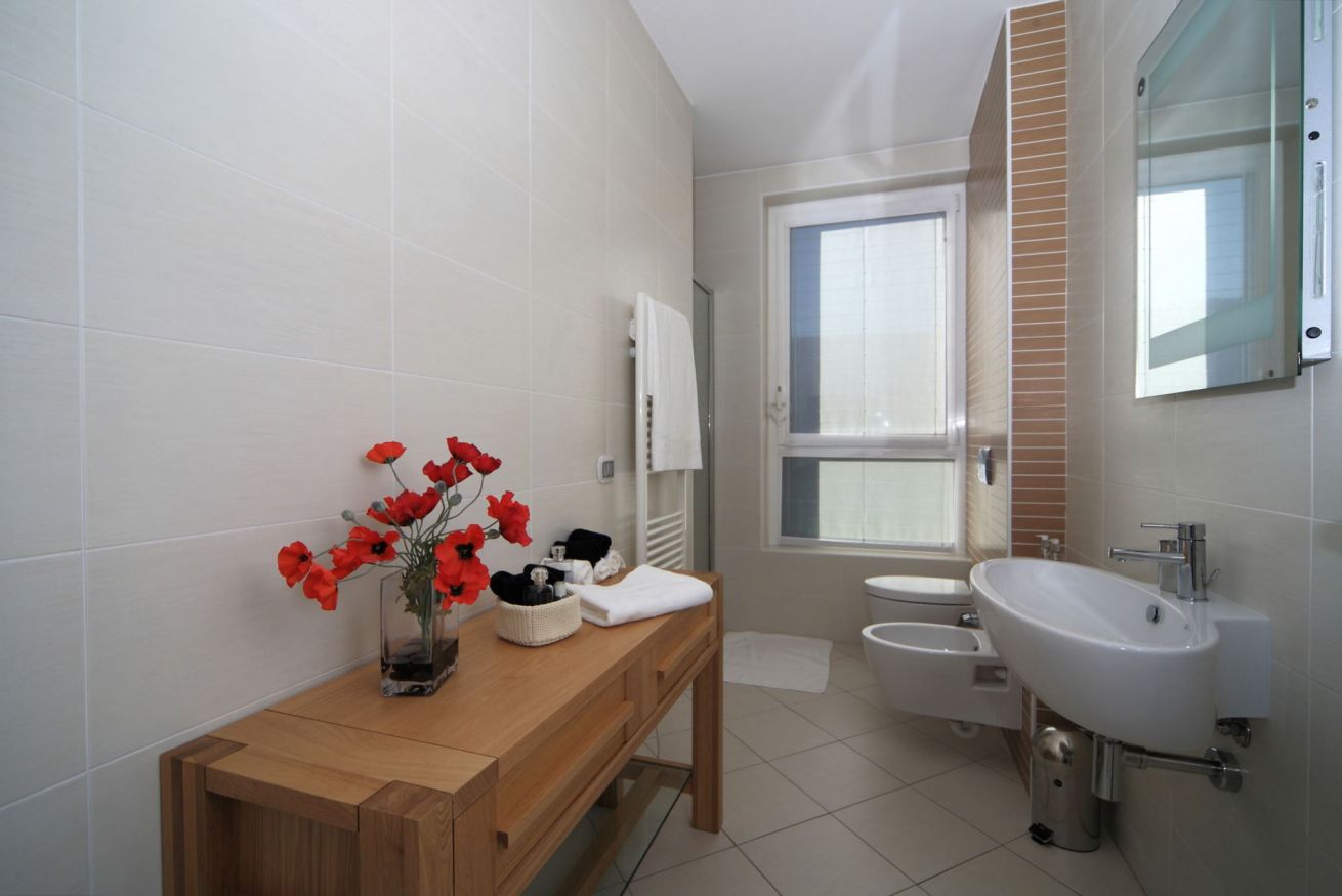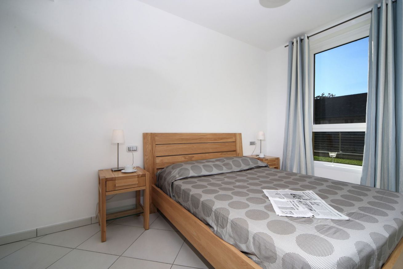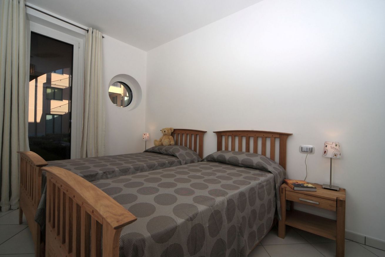 Appartamento con 1 camera da letto matrimoniale e una camera con 2 letti singoli. La terrazza e il giardino privati, arredati con tavolo e sedie, conducono direttamente alla piscina. La cucina è completamente arredata e accessoriata.