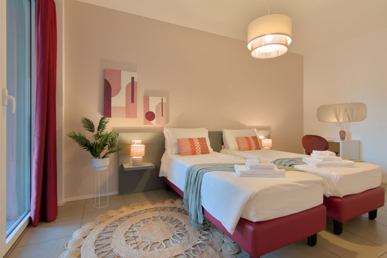Appartamento con una camera da letto matrimoniale e una camera con due letti singoli. La terrazza e il giardino esposti a sud sono arredati con tavolo e sedie. Il bagno è accessibile ai disabili. La cucina è dotata di tutte le comodità ed utensili.
