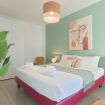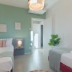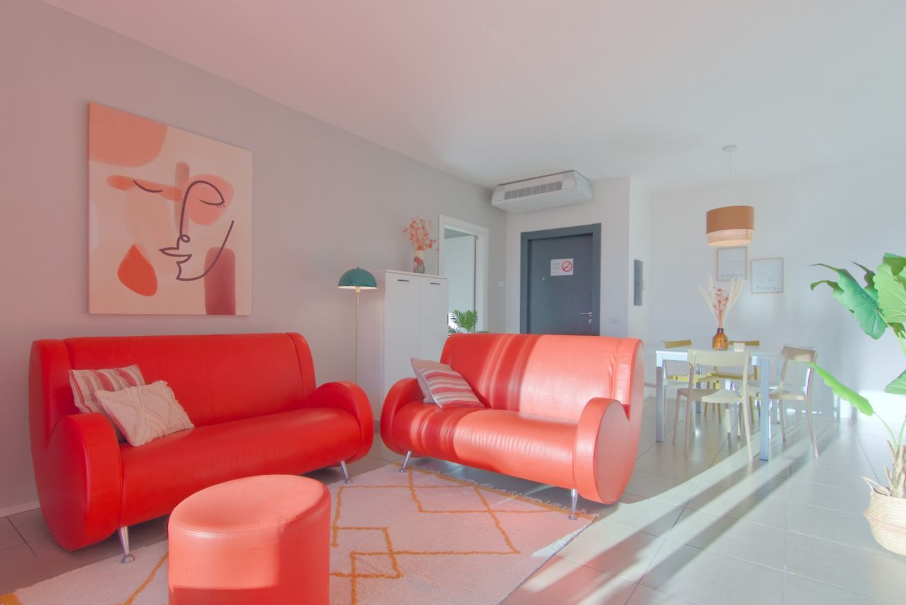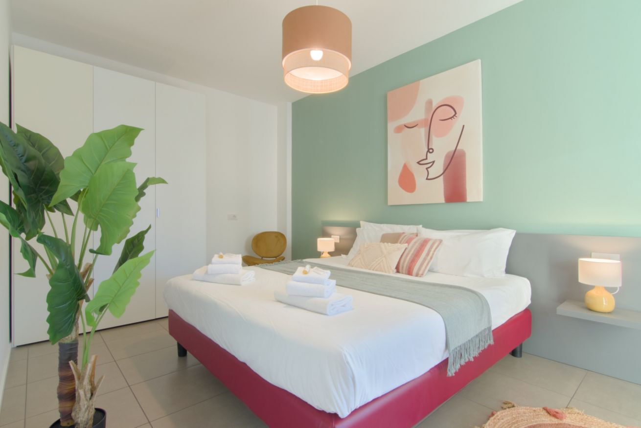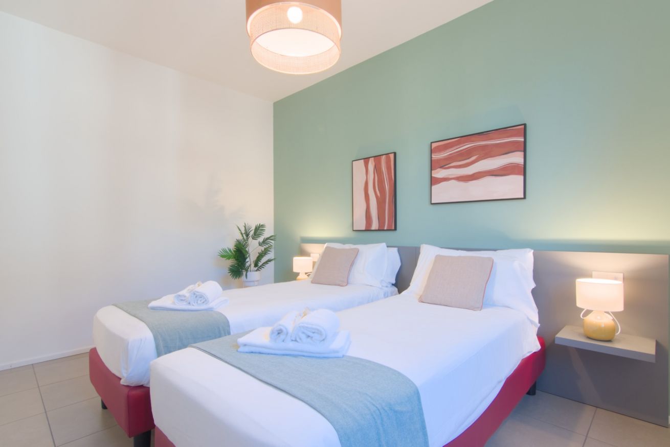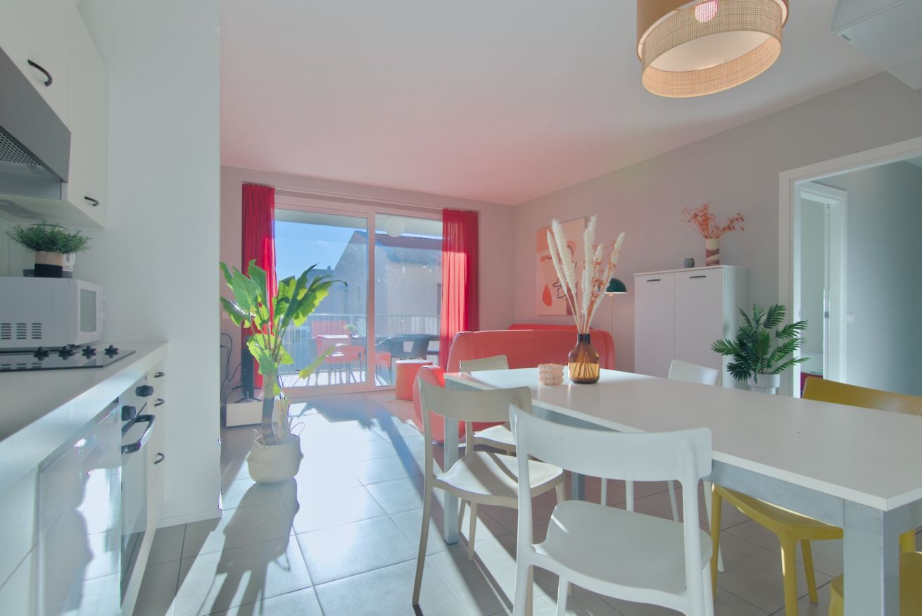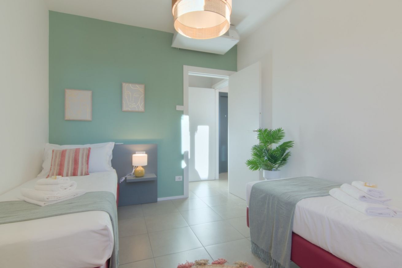 Appartamento con tre camere da letto (1 camera matrimoniale e due camere con 2 letti singoli). Il balcone esposto a sud è arredato con tavolo e sedie. La cucina è dotata di tutte le comodità ed utensili.